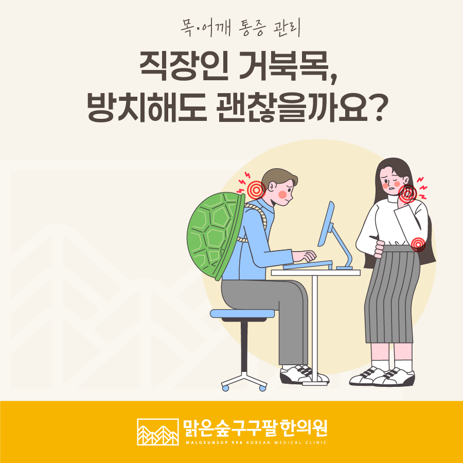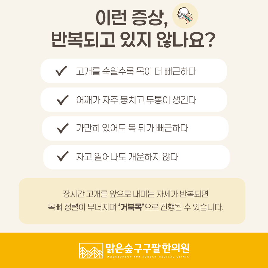 목·어깨 통증이 지속된다면 개인 상황에 맞는 관리 방향을 점검해보시길 권장드립니다.
