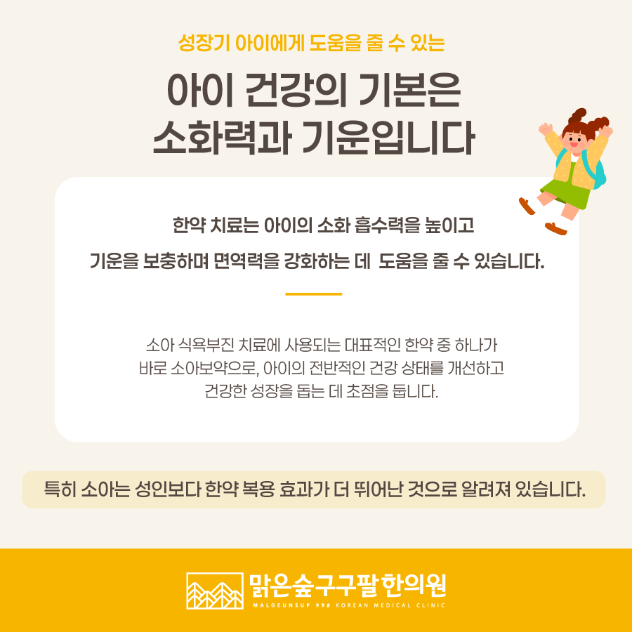 따라서 성장기에는 아이의 소화 흡수 능력을 높이고 기운을 보충해주는 관리가 중요합니다.