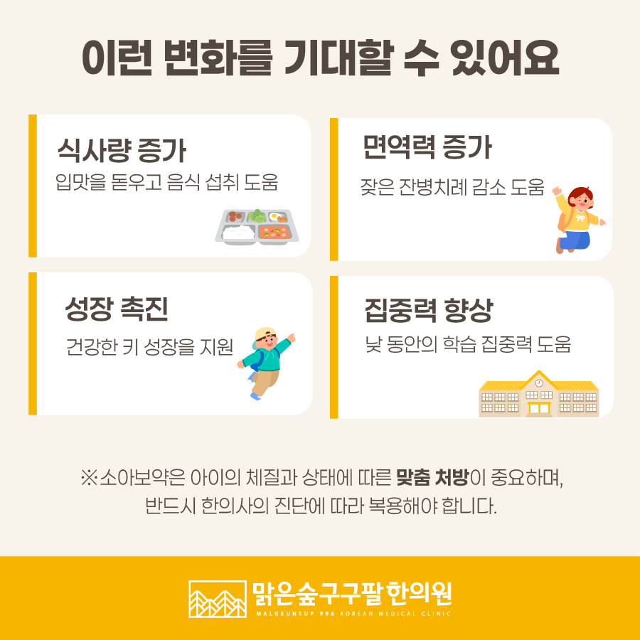 아이의 몸 상태에 맞게 소화력과 기운을 보강하면 다음과 같은 긍정적인 변화를 기대할 수 있습니다.